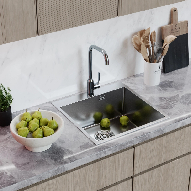 4. Простой уход и универсальность: Гладкая поверхность из нержавеющей стали легко очищается с помощью губки и моющего средства. К мойке можно подобрать любой смеситель на ваш вкус, а для ухода в условиях жесткой воды рекомендуется использовать противоизвестковые средства.