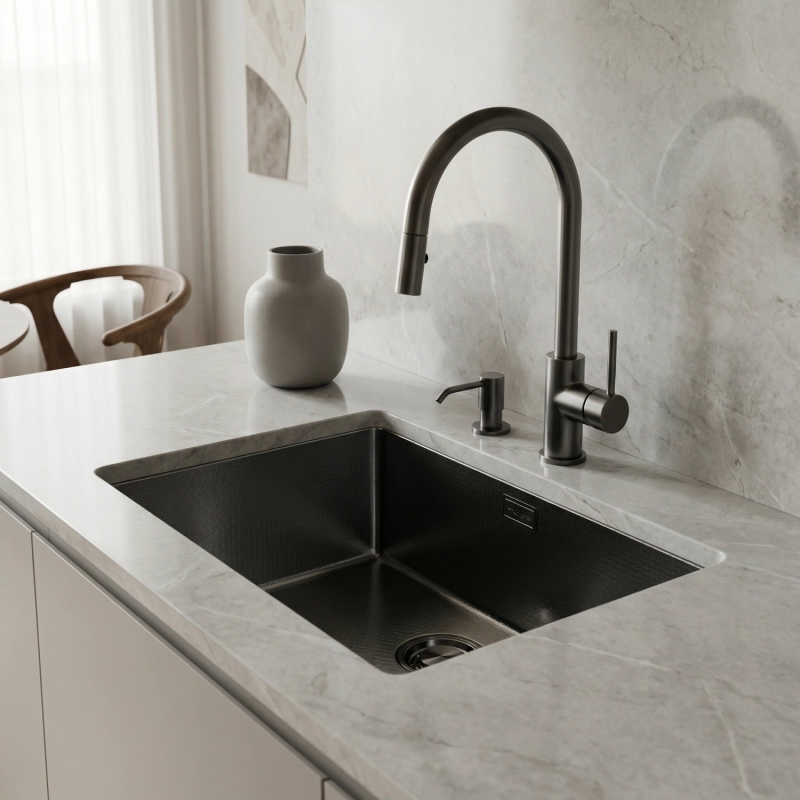 2. Эффективная шумоизоляция: Двухкомпонентное противошумное покрытие (резиновая накладка + специальный состав) на обратной стороне чаши минимизирует звуки от воды и посуды, создавая комфортную атмосферу на кухне.