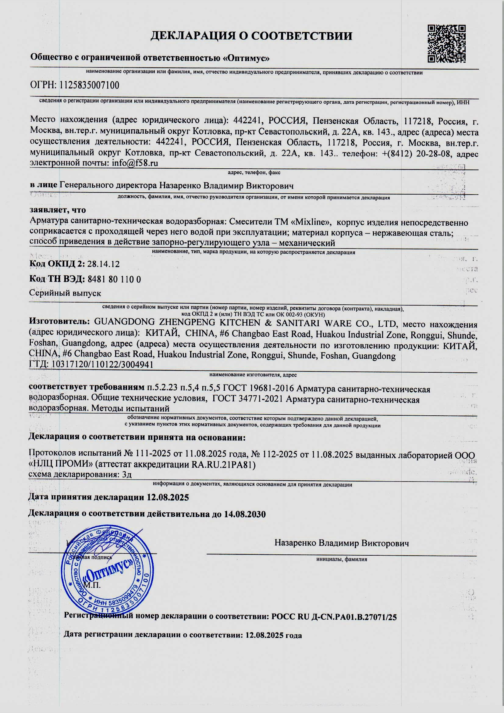 Каждая модель имеет официальную декларацию соответствия и прошла полный цикл испытаний по ГОСТ №19681. Это означает, что смесители полностью безопасны для здоровья и соответствуют всем строгим требованиям. Мы подтвердили качество документально - вам остается только наслаждаться безупречной работой. MIXLINE - выбор тех, кто ценит комфорт, стиль, качество!