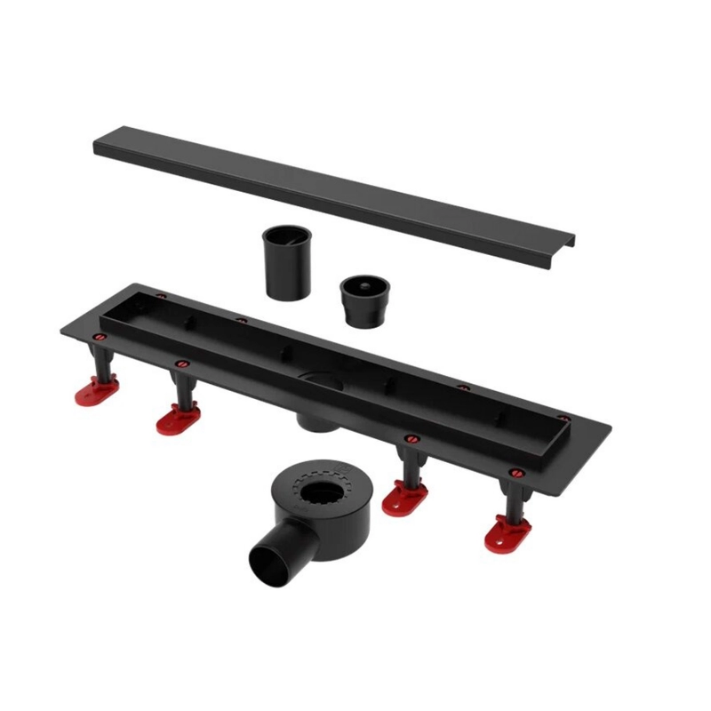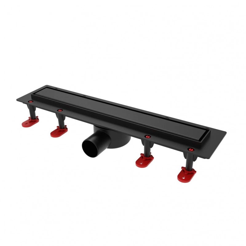 Трап линейный ТП-55C-900 решетка из нерж. стали с гориз. выходом D50 мм, рамка из пластика ЧЕРНЫЙ