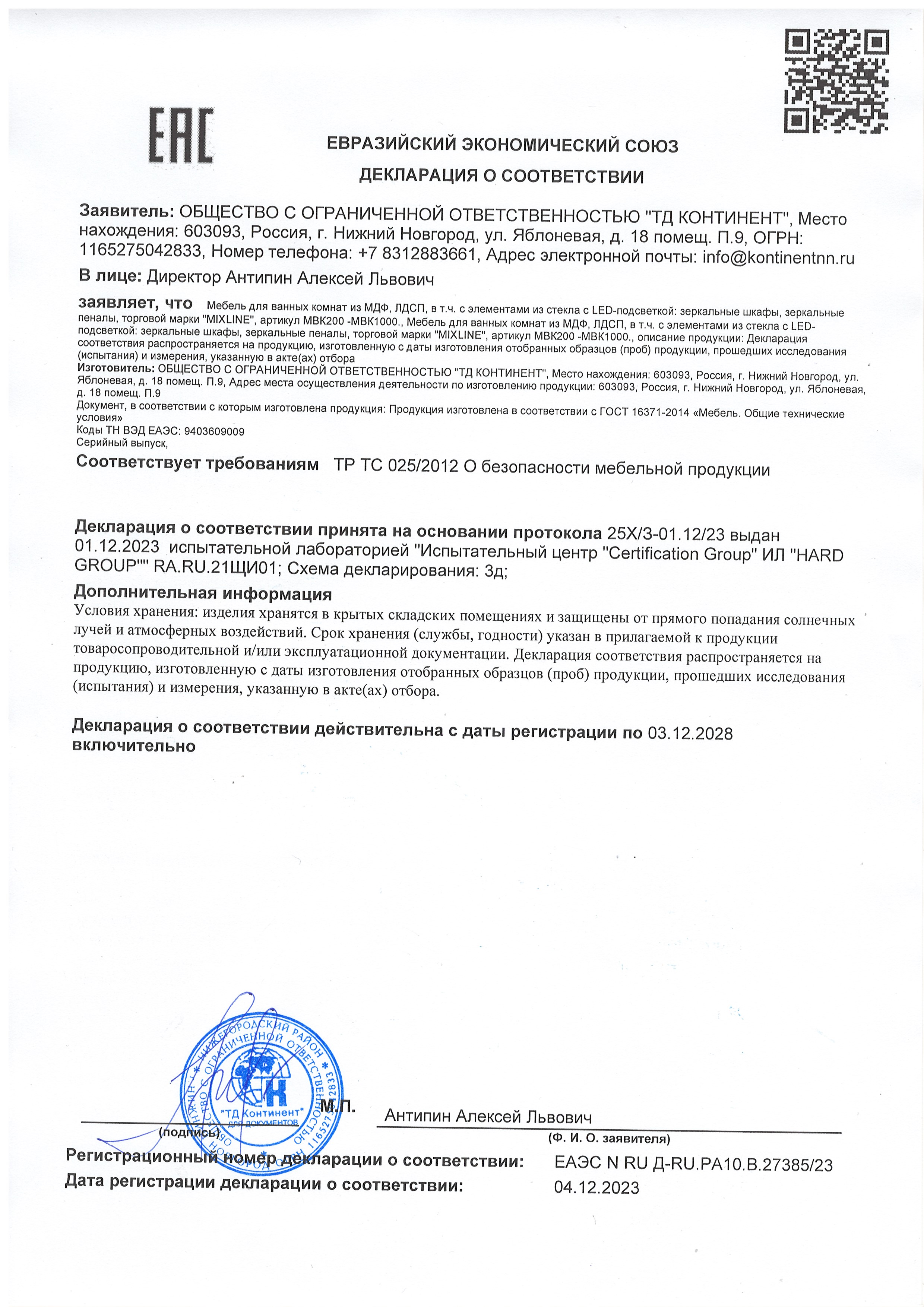 Декларация на зеркала MIXLINE до 03.12.28 Континент